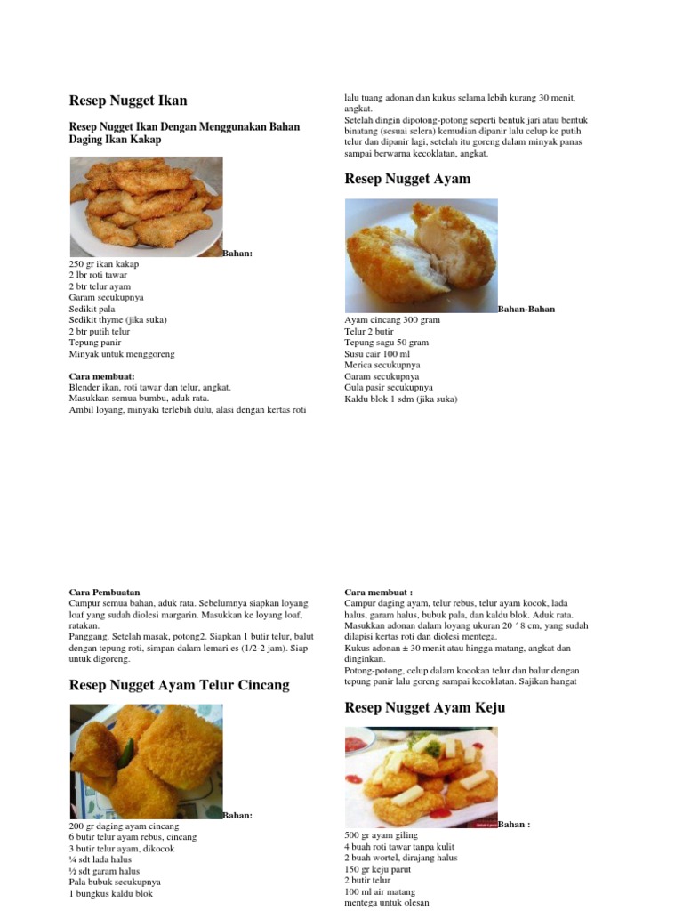 50 gram tepung sagu. 50 gram jagung pipilan rebus matang tiriskan. Resep Nugget Ikan Adalah cara membuat nugget yang bahan utamanya berupa ikan segar dan dibalur dengan tepung panir yang krispi.